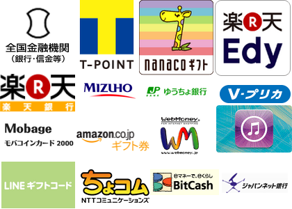 WebMoney、楽天Edy、ちょコム(JALマイル可)、G-MONEY、BitCash